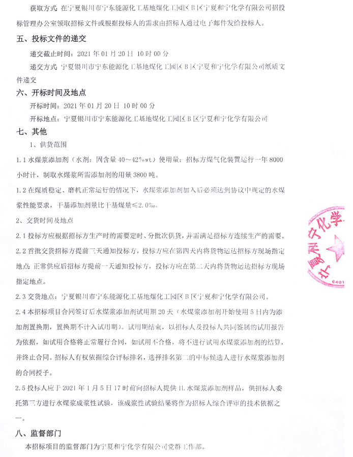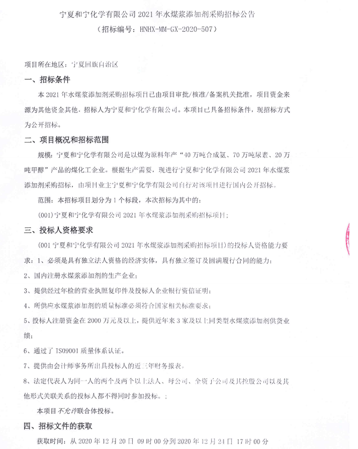 寧夏和寧化學(xué)有限公司2021年水煤漿添加劑采購招標(biāo)公告