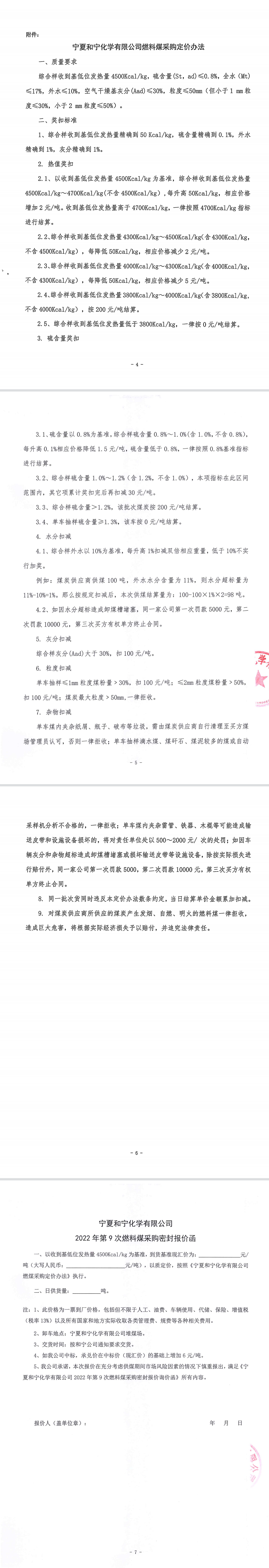 寧夏和寧化學有限公司2022年第9次燃料煤采購密封報價詢價函