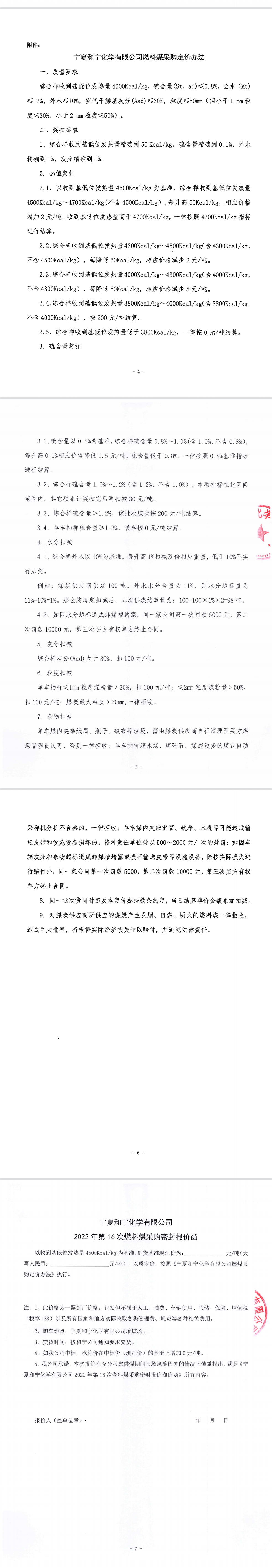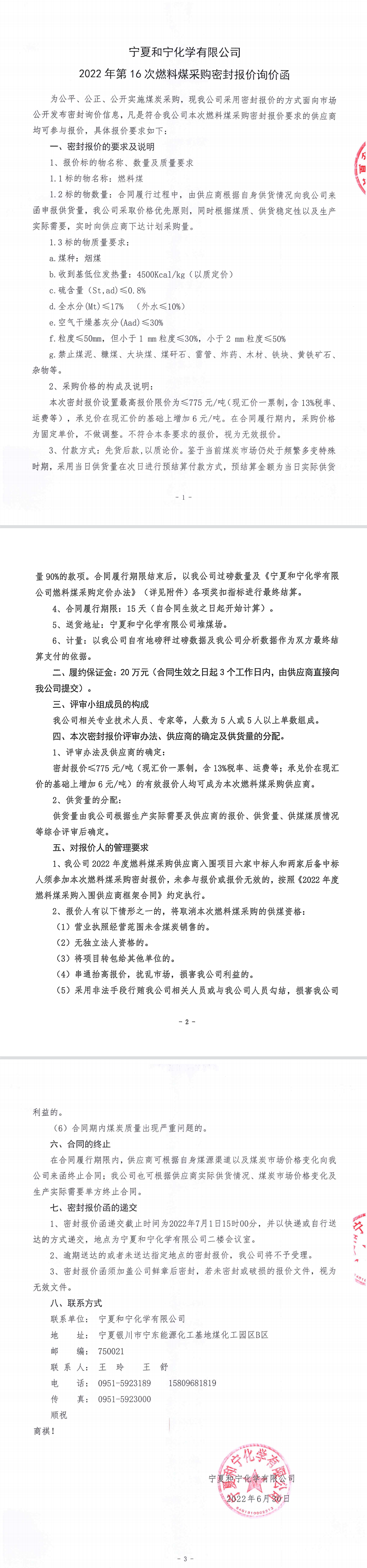寧夏和寧化學(xué)有限公司2022年第16次燃料煤采購密封報(bào)價(jià)詢價(jià)函
