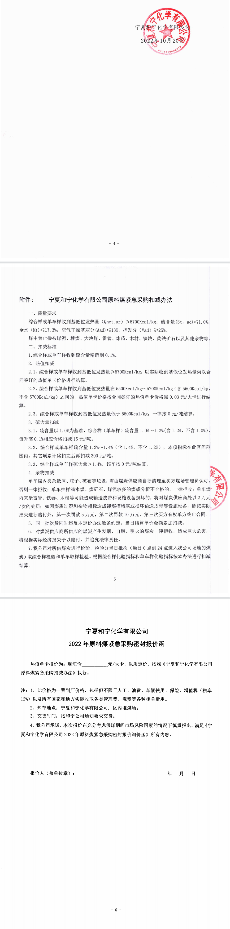 寧夏和寧化學(xué)有限公司2022年原料煤緊急采購(gòu)密封報(bào)價(jià)詢價(jià)函