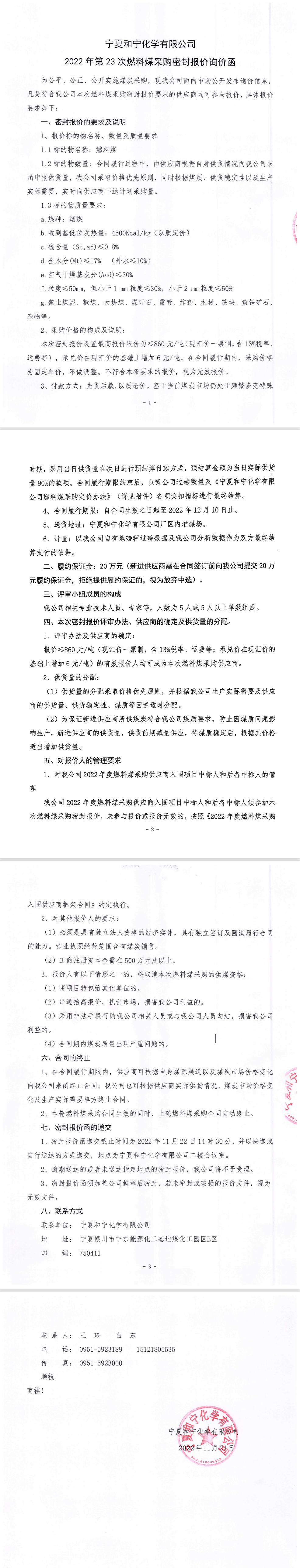 寧夏和寧化學(xué)有限公司2022年第23次燃料煤采購密封報價詢價函