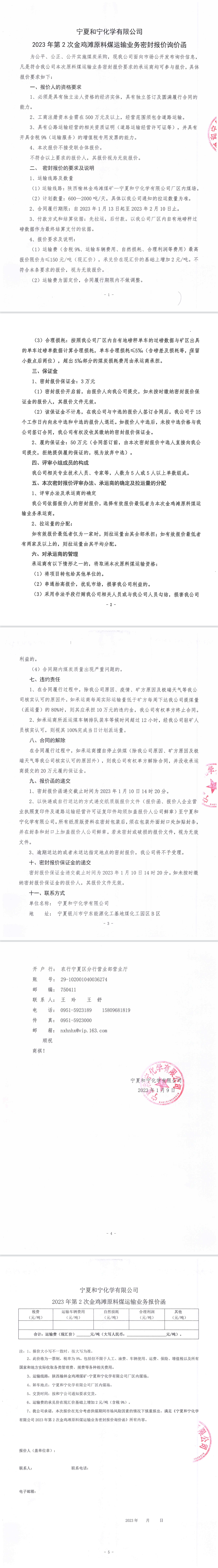 寧夏和寧化學有限公司2023年第2次金雞灘原料煤運輸業(yè)務密封報價詢價函