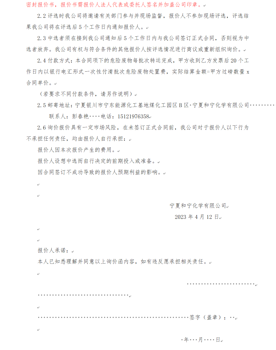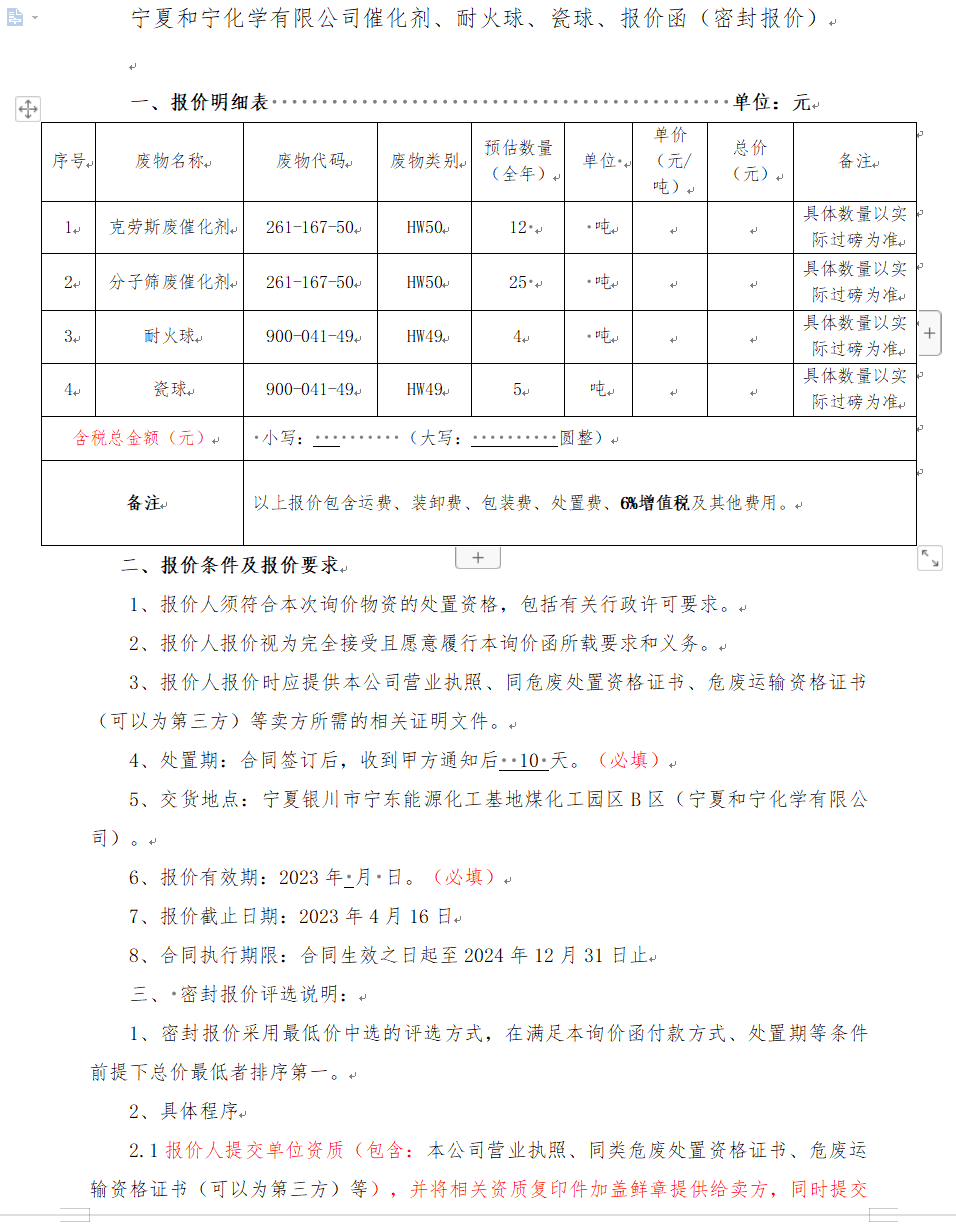 寧夏和寧化學(xué)有限公司催化劑、耐火球、瓷球、報價函(密封報價)