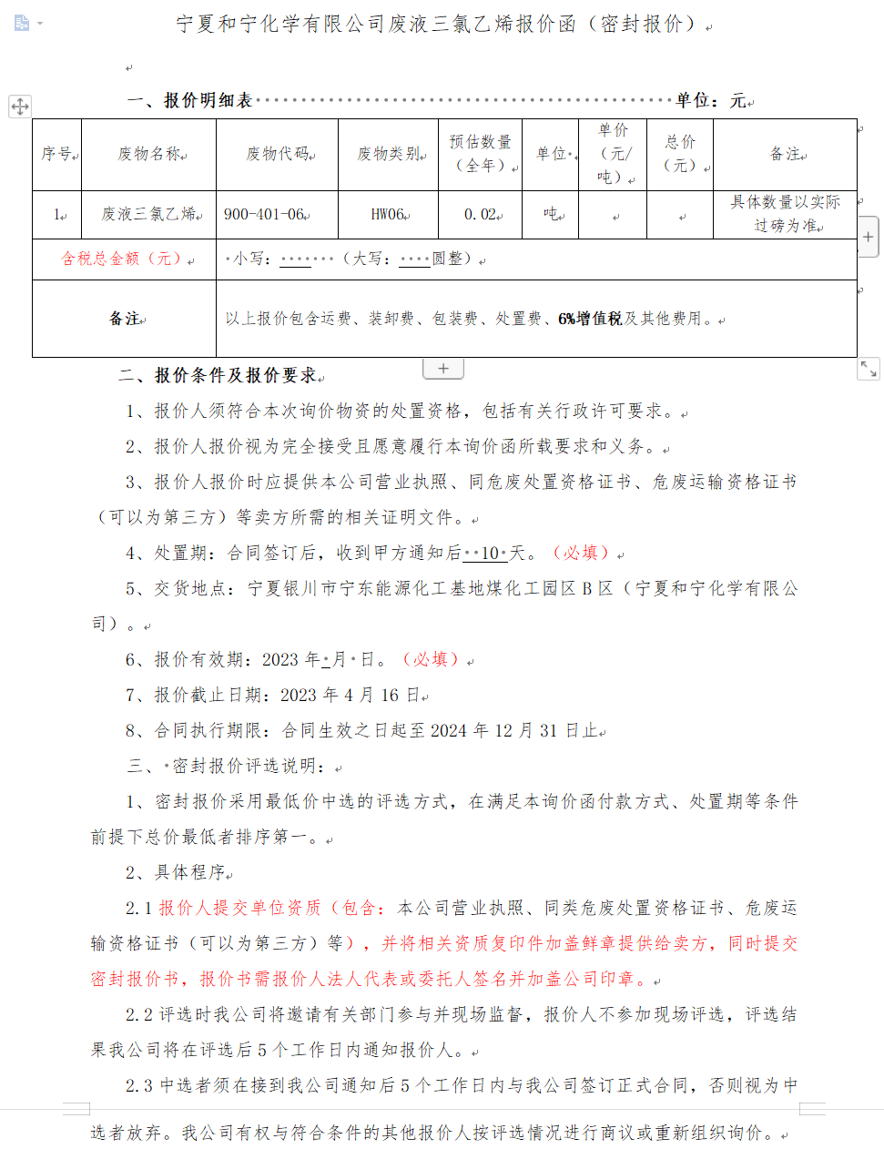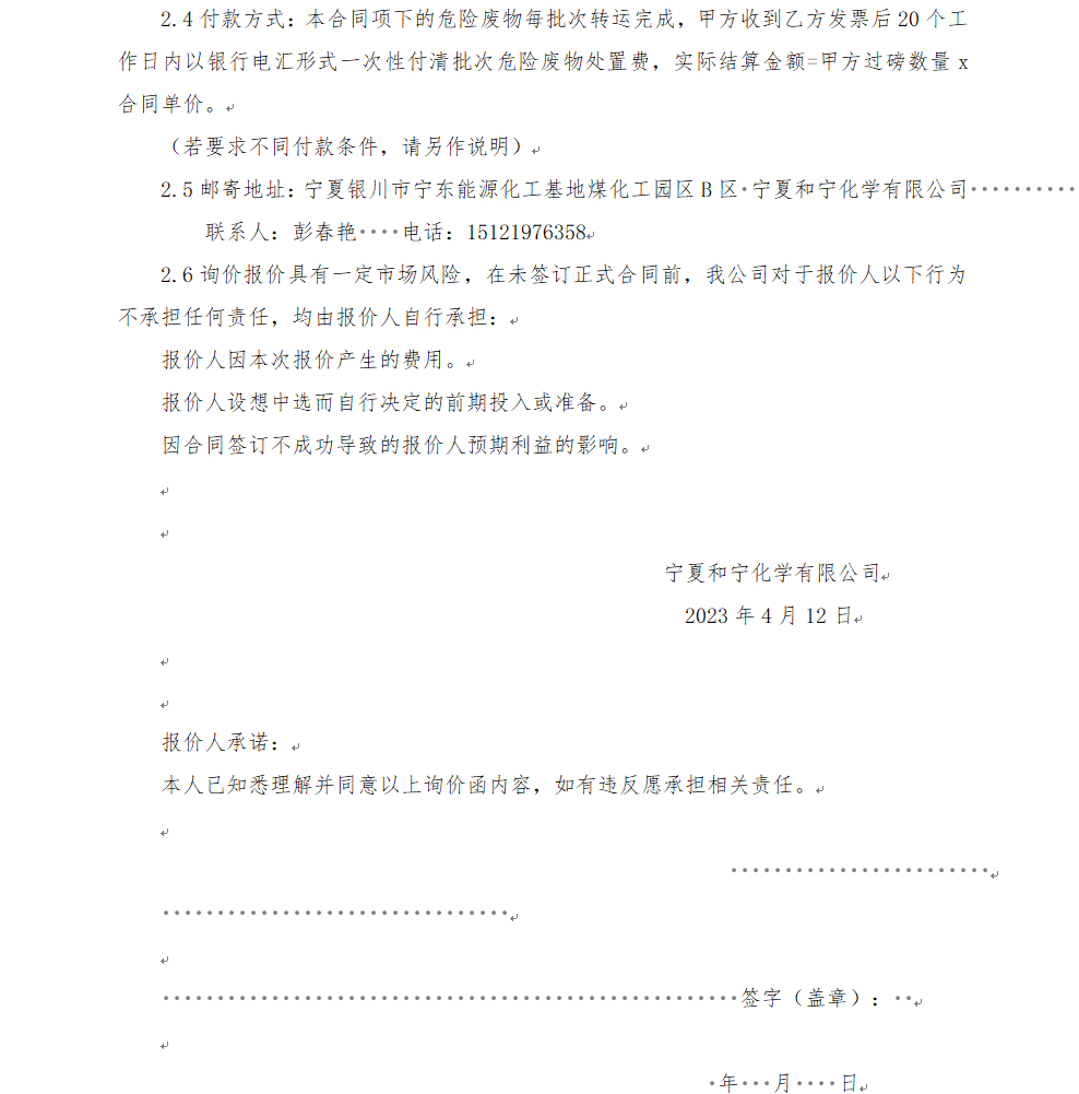 寧夏和寧化學(xué)有限公司廢液三氯乙烯報(bào)價(jià)函(密封報(bào)價(jià))