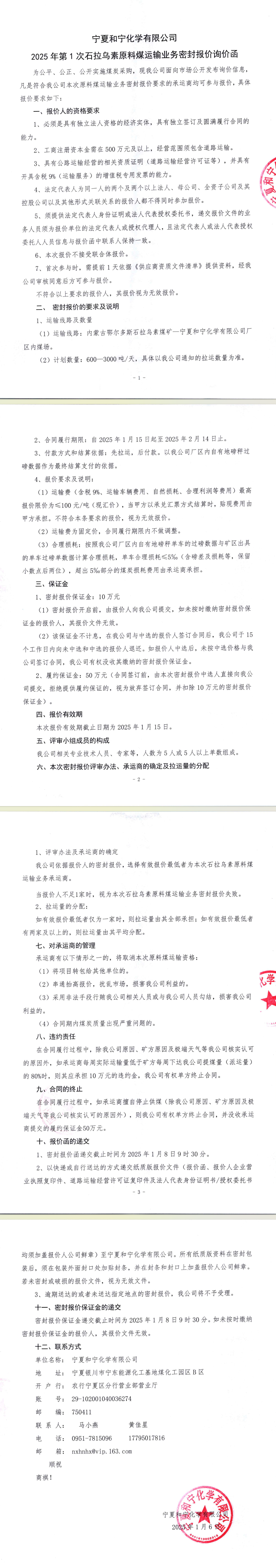 寧夏和寧化學(xué)有限公司2025年第1次石拉烏素原料煤運(yùn)輸業(yè)務(wù)密封報(bào)價(jià)詢價(jià)函