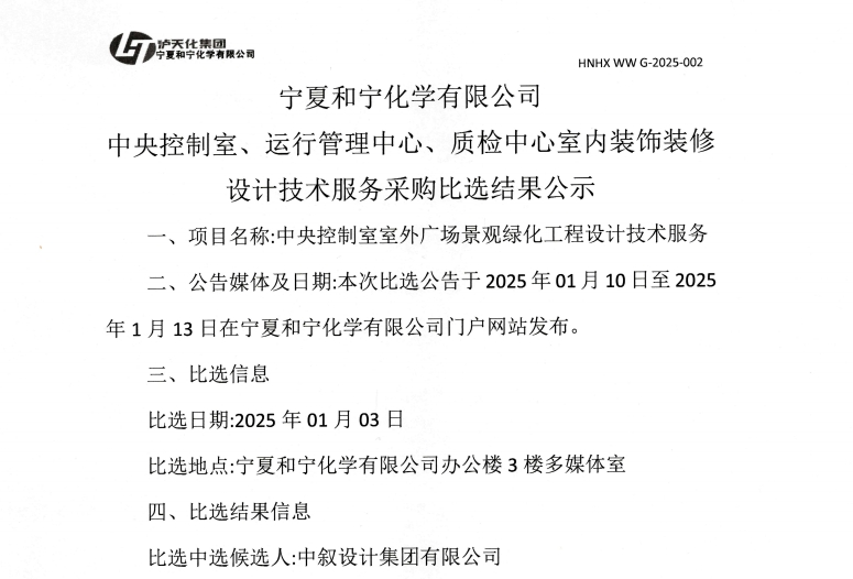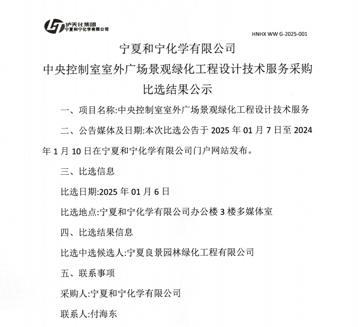 寧夏和寧化學(xué)有限公司中央控制室室外廣場(chǎng)景觀綠化工程設(shè)計(jì)技術(shù)服務(wù)采購(gòu)比選結(jié)果公示
