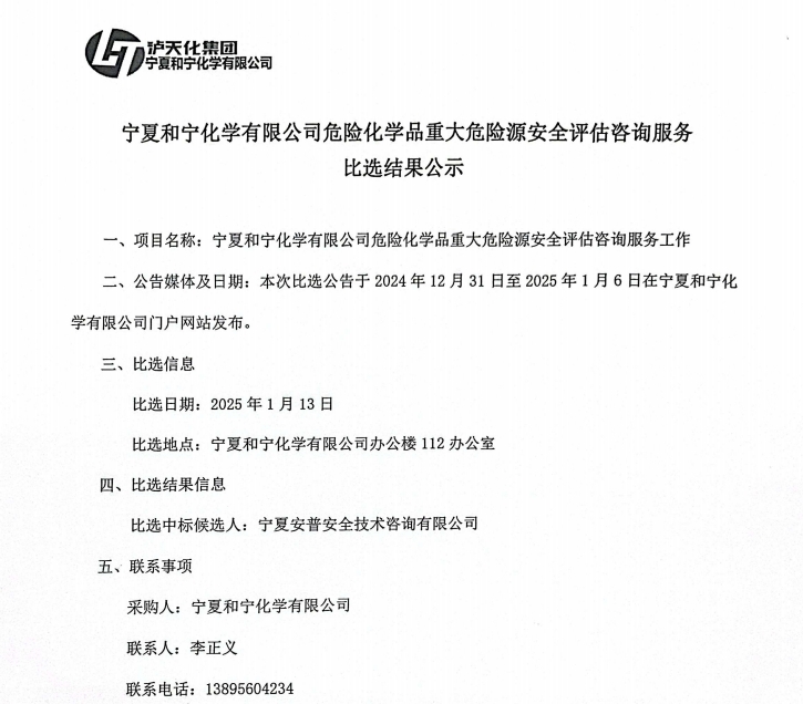 寧夏和寧化學(xué)有限公司危險(xiǎn)化學(xué)品重大危險(xiǎn)源安全評(píng)估咨詢服務(wù)比選結(jié)果公示