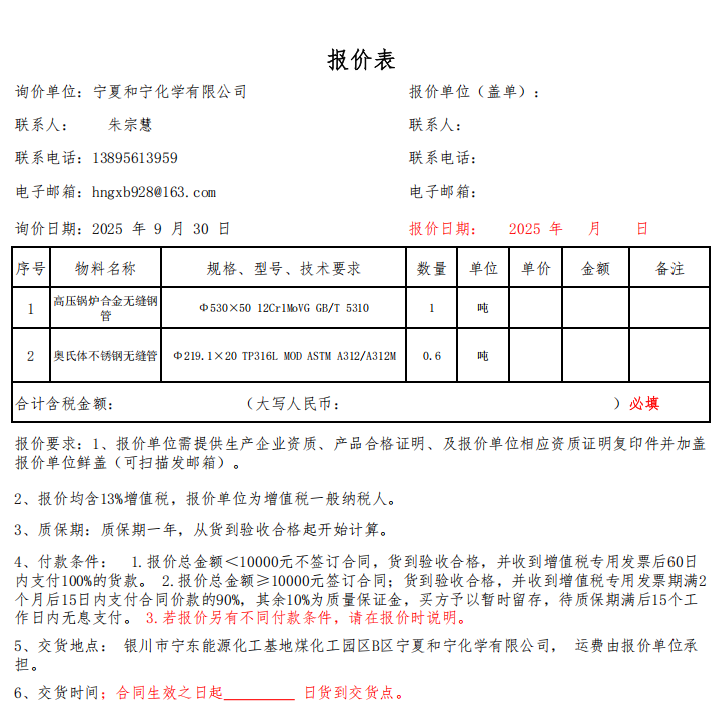 寧夏和寧化學(xué)有限公司大修用無縫管采購詢價書.pdf