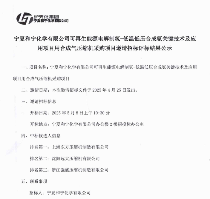 寧夏和寧化學(xué)有限公司可再生能源電解制氫一低溫低壓合成氨關(guān)鍵技術(shù)及應(yīng)用項(xiàng)目用合成氣壓縮機(jī)采購項(xiàng)目邀請招標(biāo)評(píng)標(biāo)結(jié)果公示.pdf [全文]