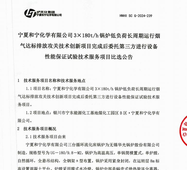 寧夏和寧化學(xué)有限公司3x180t/h鍋爐低負(fù)荷長(zhǎng)周期運(yùn)行煙氣達(dá)標(biāo)排放攻關(guān)技術(shù)創(chuàng)新項(xiàng)目完成后委托第三方進(jìn)行設(shè)備性能保證試驗(yàn)技術(shù)服務(wù)項(xiàng)目比選公告.pdf [全文]