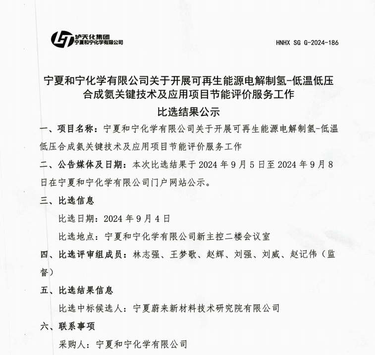 寧夏和寧化學(xué)有限公司關(guān)于開(kāi)展可再生能源電解制氫-低溫低壓合成氨關(guān)鍵技術(shù)及應(yīng)用項(xiàng)目節(jié)能評(píng)價(jià)服務(wù)工作比選結(jié)果公示.pdf [全文]