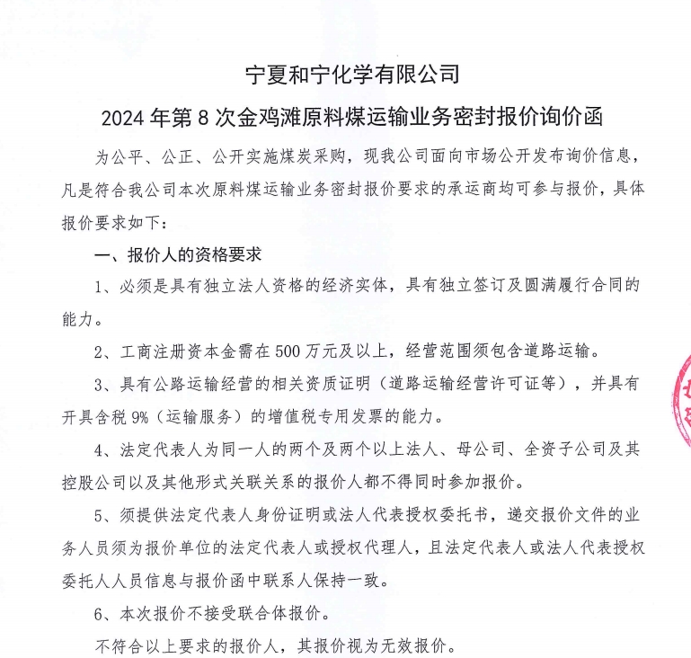 寧夏和寧化學(xué)有限公司2024 年第8次金雞灘原料煤運(yùn)輸業(yè)務(wù)密封報(bào)價(jià)詢(xún)價(jià)函.pdf [全文]