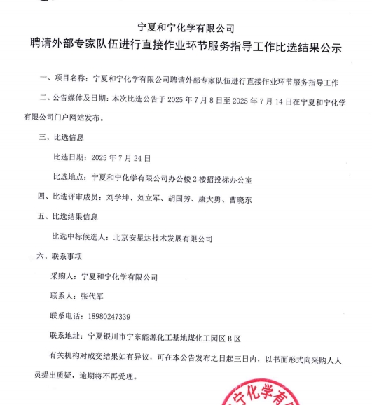 寧夏和寧化學(xué)有限公司聘請外部專家隊伍進(jìn)行直接作業(yè)環(huán)節(jié)服務(wù)指導(dǎo)工作比選結(jié)果公示.pdf [全文]
