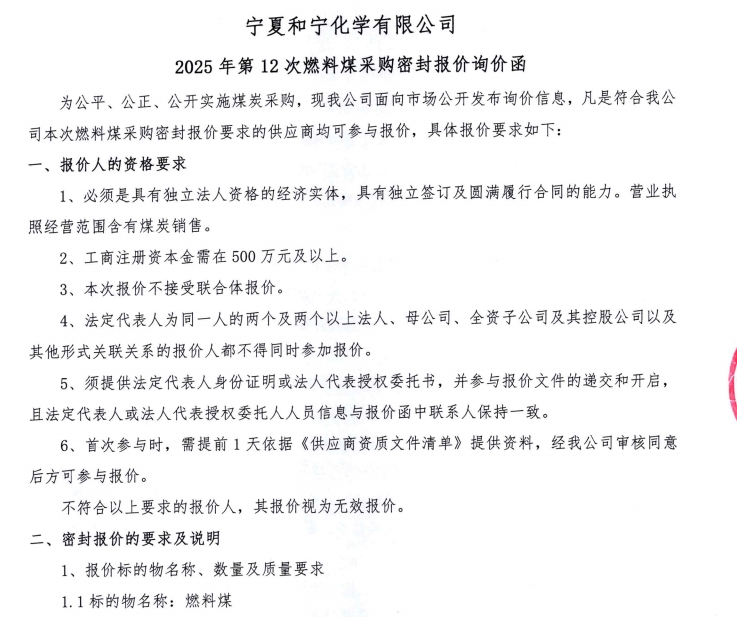 寧夏和寧化學(xué)有限公司2025年第12次燃料煤采購密封報(bào)價(jià)詢價(jià)函.pdf [全文]