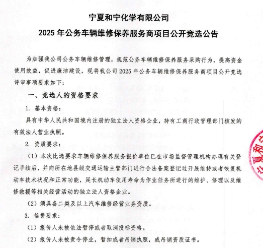 寧夏和寧化學(xué)有限公司2025 年公務(wù)車輛維修保養(yǎng)服務(wù)商項(xiàng)目公開競選公告.pdf [全文]