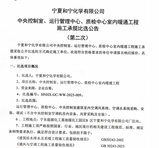 寧夏和寧化學(xué)有限公司中央控制室、運(yùn)行管理中心、質(zhì)檢中心室內(nèi)暖通工程施工承攬比選公告(第二次).pdf [全文]