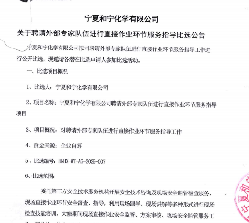 寧夏和寧化學(xué)有限公司關(guān)于聘請外部專家隊(duì)伍進(jìn)行直接作業(yè)環(huán)節(jié)服務(wù)指導(dǎo)比選公告.pdf [全文]