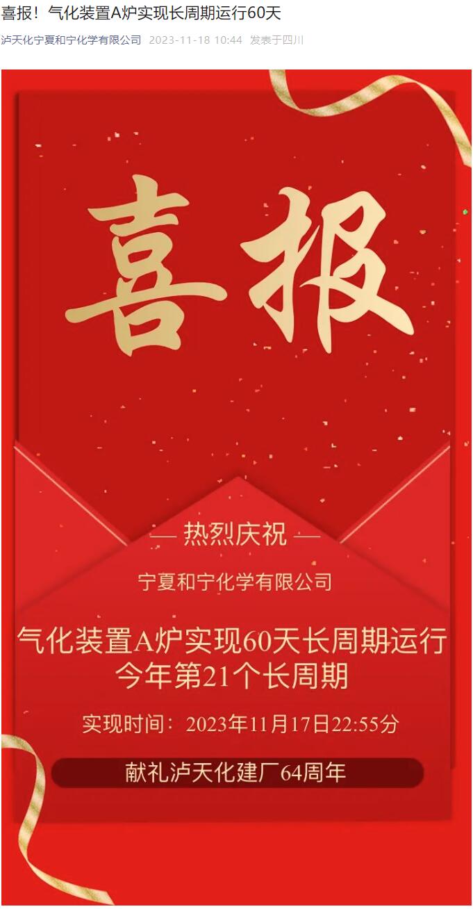 喜報!氣化裝置A爐實現(xiàn)長周期運行60天