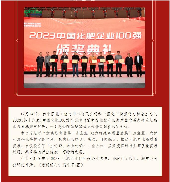喜訊!和寧公司獲評“2023中國化肥100強”榮譽