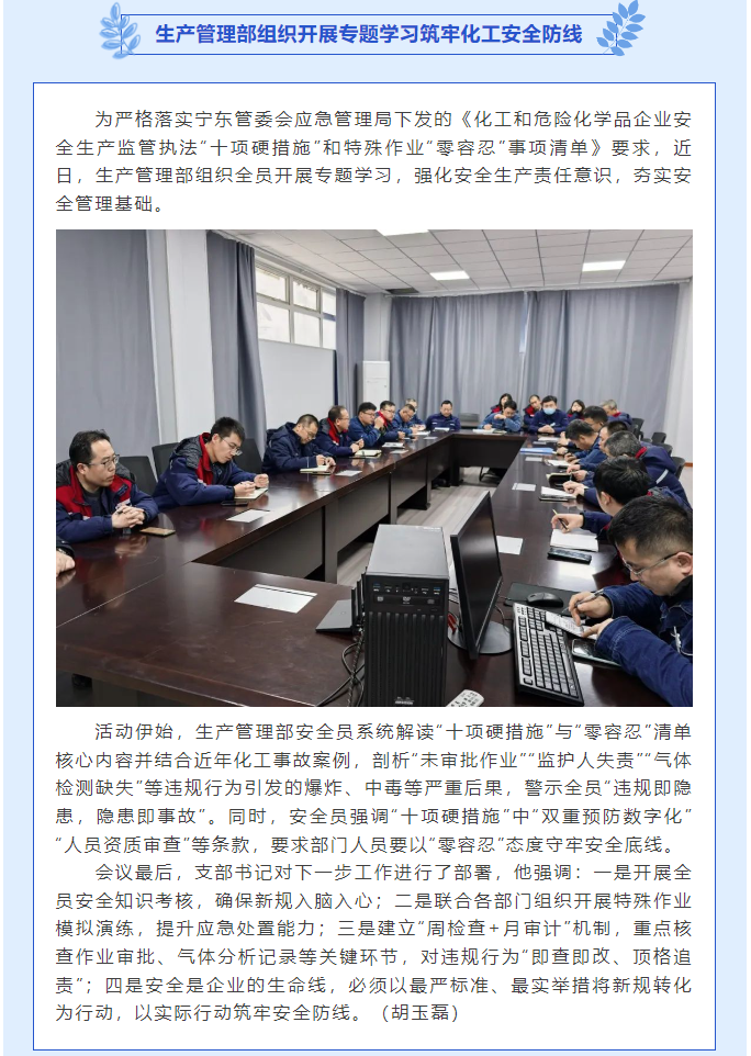 生產(chǎn)管理部組織開展專題學(xué)習(xí)筑牢化工安全防線