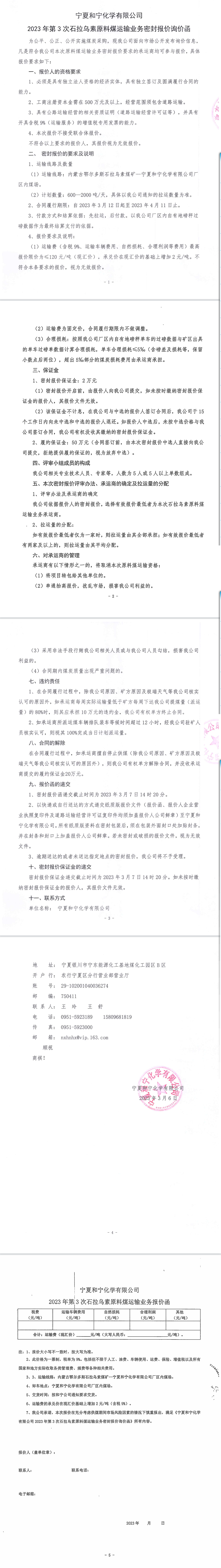 寧夏和寧化學有限公司2023年第3次石拉烏素原料煤運輸業(yè)務密封報價詢價函