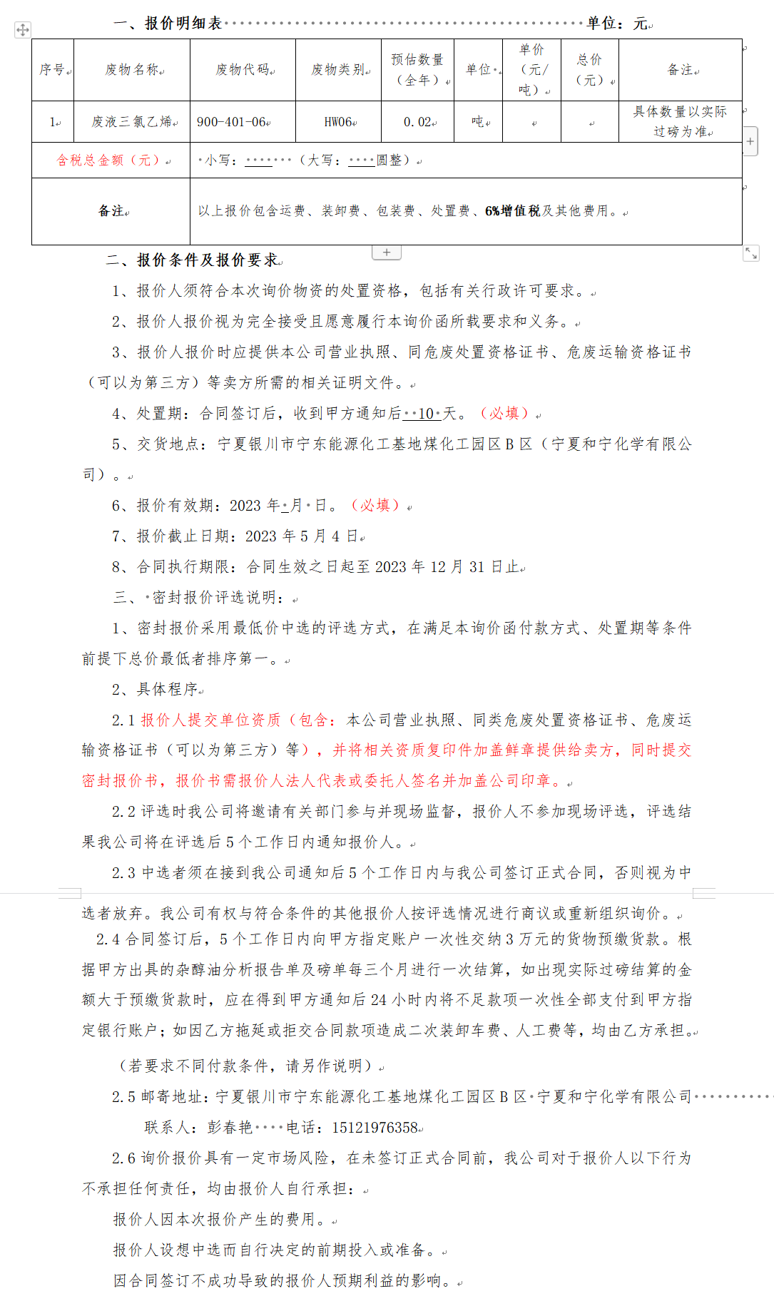 寧夏和寧化學(xué)有限公司廢液三氯乙烯報(bào)價(jià)函(密封報(bào)價(jià))