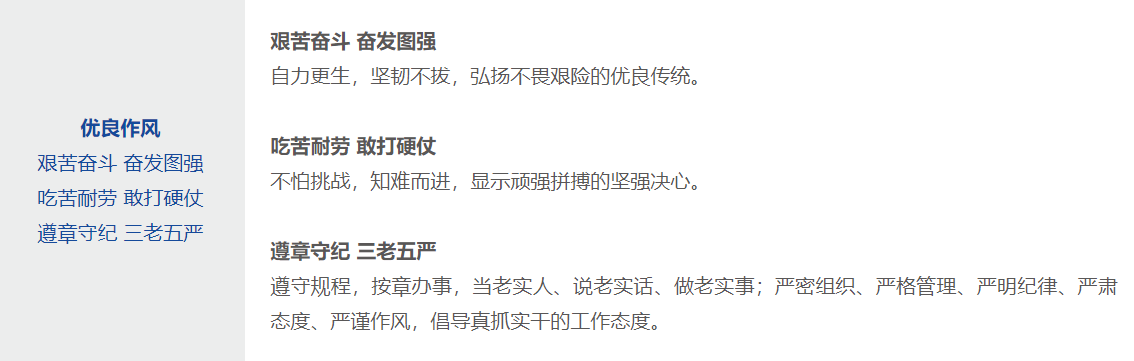 優(yōu)良作風 艱苦奮斗 奮發(fā)圖強 吃苦耐勞 敢打硬仗 遵章守紀 三老五嚴